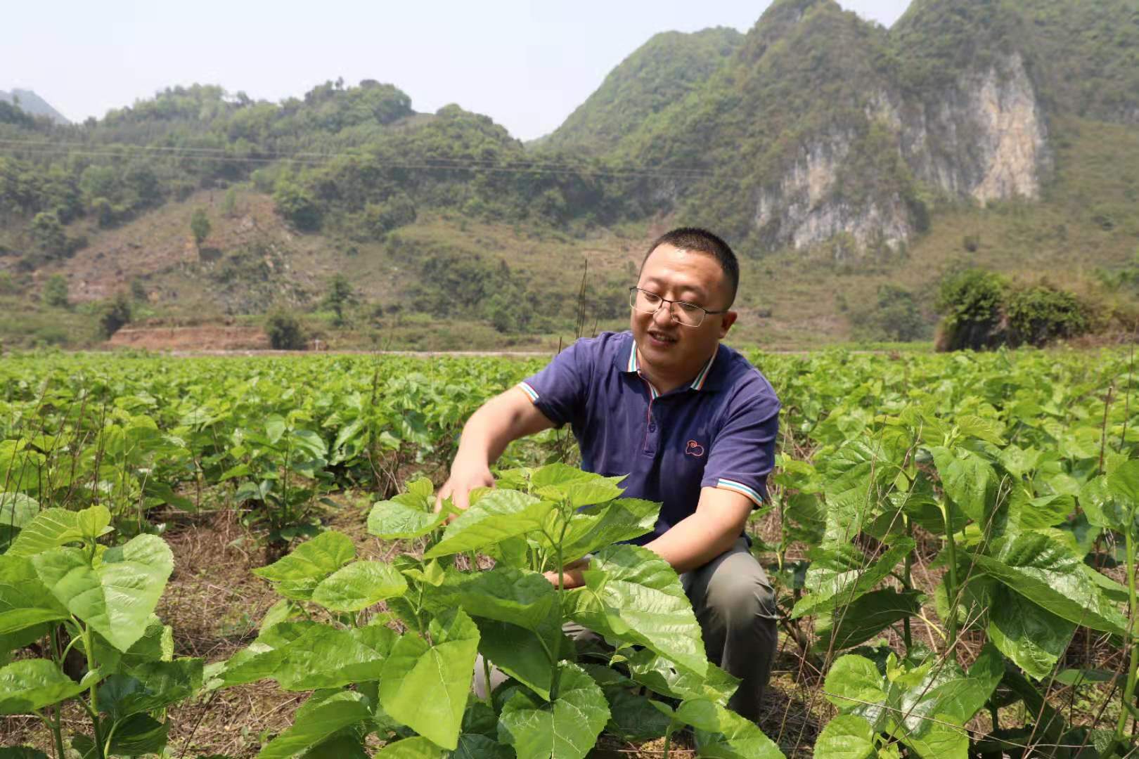我們到爛村,駐村第一書記廖恒就駕車帶我們到位于隴居屯爛村壩的村集體經(jīng)濟桑蠶養(yǎng)殖示范基地,實地察看桑葉長勢情況。車子轉了好幾個彎,才開到的示范基地上面的山坳,俯視前方的山腳就看到桑蠶地了。然而車還要往下開,再轉過幾個彎,有的彎道要經(jīng)過兩次倒車才能通過,路還很陡,一直下到山腳。一路上,廖恒就告訴我們,這條路在搞村集體經(jīng)濟示范地之前,車子是下不來的,建立示范地后,通過努力找到相關企業(yè)和部門幫助解決經(jīng)費,才把水泥路鋪上。